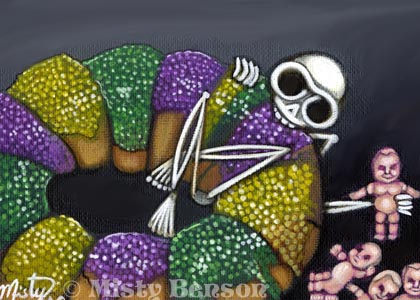Greedy Skelly pounds down the #kingcake in search of the #kingcakebaby! Looks like he has a whole screeching bundle! #MardiGras #fattuesday