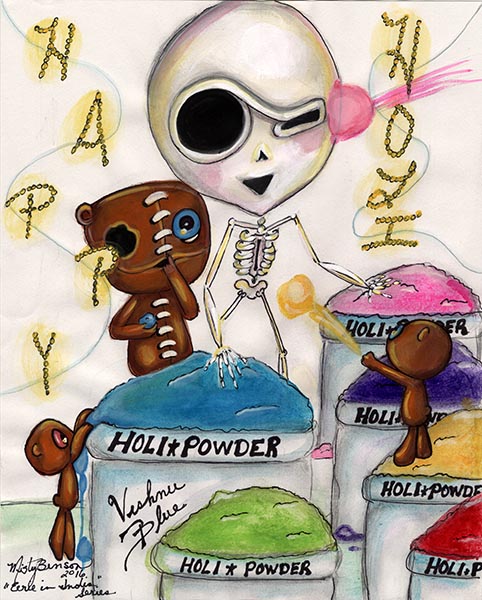 Strolling through the gardens of the Taj Mahal, the Big Eye girl shades herself with a lovely lotus flower umbrella. Fun Fact: For the Eerie in India Series, I often painted with colored Holi powders (used for throwing during the festival) that I brought back from India. For example, in Sunday Stroll, I mixed four… Continue reading Sunday Stroll… Countdown to Holi continues…
